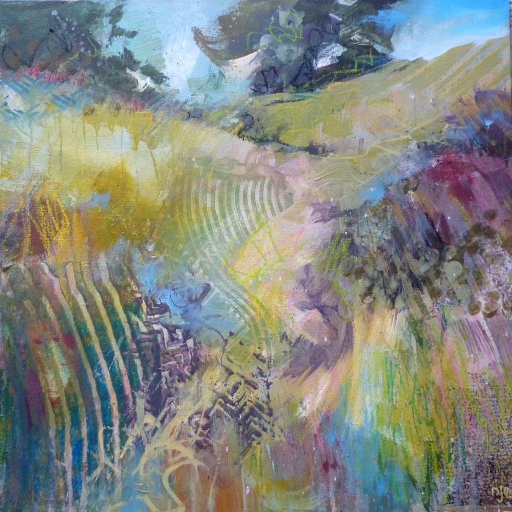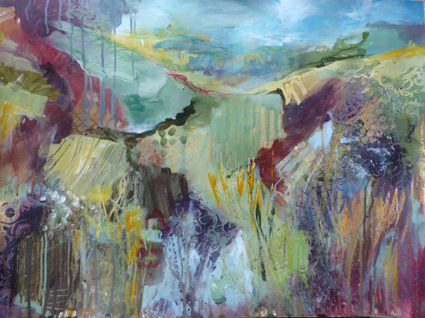 My work is a subjective take on the coast, fields and lanes near me in North Cornwall. I start from what I see when walking, then the process of painting imbues the work with the colours and feelings that the landscape evokes in me.